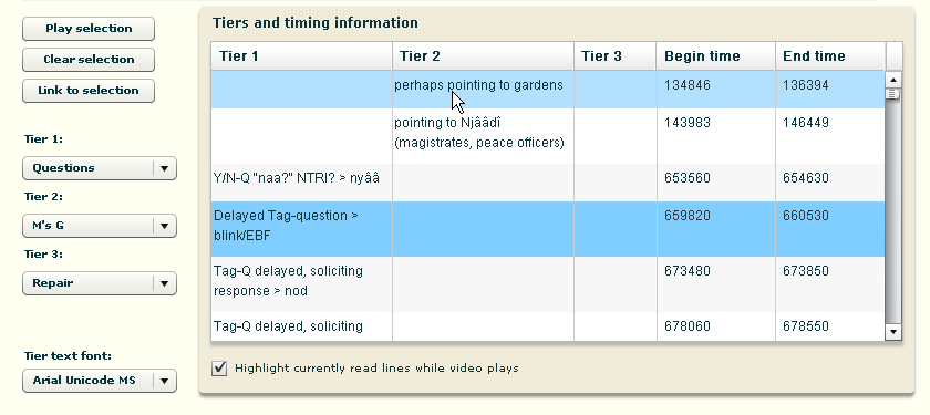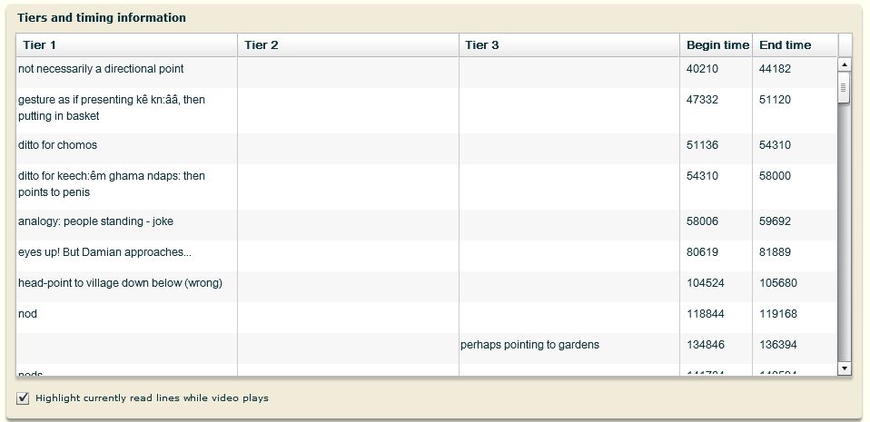 Diese Sicht zeigt alle Annotationen von den gewählten Schichten mit ihren Start- und Endzeiten im Medieninformation-Feld an. Die Annotationen werden in chronologischer Reihenfolge angezeigt. Sie können auf eine Annotation klicken, um den entsprechenden Teil des Medienobjekts abzuspielen. Während das Video weiterläuft, werden die relevanten Teile hervorgehoben. Zusätzlich können Sie links vom Raster den Typ einer Schicht aus einem Aufklappmenü wählen.