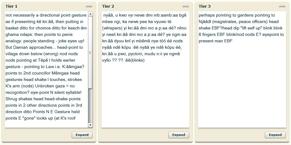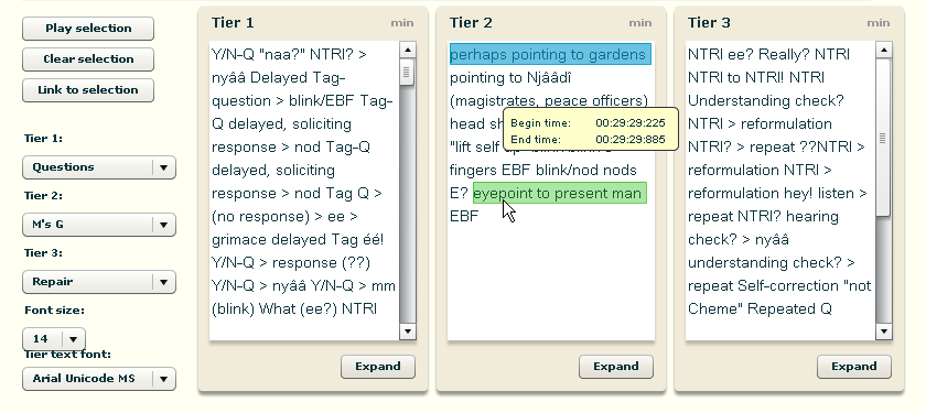 Diese Sicht zeigt eine Spalte für jede der gewählten Schichten. In jeder Spalte werden die Annotationen einer Schicht zeilenweise angezeigt. Sie können auf einen Annotation klicken, um den entsprechenden Teil der Mediendatei abzuspielen. Wenn die Aufnahme abgespielt wird, werden die relevanten Teile der Annotationen rot hervorgehoben.