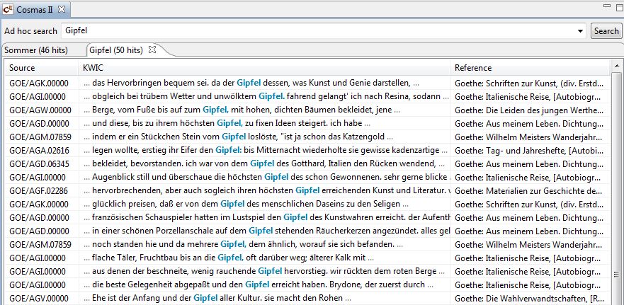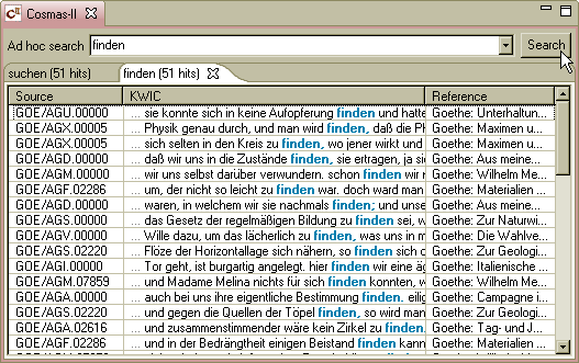 Die Ergebnisse werden im unteren Feld mit Ihrer Quelle, einer KWIC-Ansicht (Key Word in Context), die das gesuchte Schlüsselwort in seinem Kontext zeigt, und einer Referenz angezeigt. Ergebnisse verschiedener Anfragen werden in verschiedenen Reitern angezeigt. Verwenden Sie das Kontextmenü, um ausgewählte Ergebnisse in die Zwischenablage zu kopieren, sie als CSV-Datei zu exportieren oder um alle Ergebnisse auszuwählen.